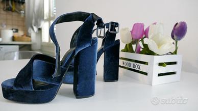 Sandali con tacco e plateau Bershka effetto vellutino blu scuro, usate poco.