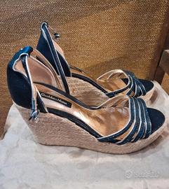 sandali estivi con tacco. colore blu e dettagli in spago. fascia sul davanti e allacciatura alla caviglia. taglia 40. buono stato, come da foto.