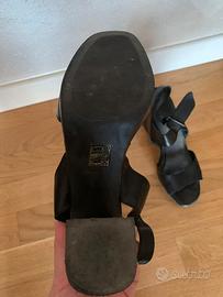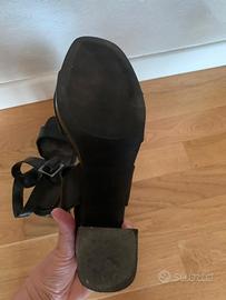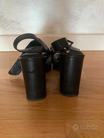 Sandali con tacco largo in pelle nera, chiusura con cinturino. Altezza tacco 10 cm ma molto comodo. Usati, in buone condizioni generali.