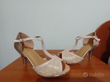 Vendo sandali marca Miss Globo con tacco di circa 8 cm n. 39. Colore di base oro rosa con strass in tinta e tallone e tacco lucido. Fascia larga e comoda. Nuove mai indossate.