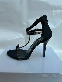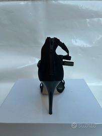 Eleganti sandali neri decorati con tre fiocchi, di cui due interamente ricoperti di brillantini, di marca Ovyé by Cristina Lucchi – Made in Italy. Le fasce che li sorreggono sono anch'esse impreziosite da dettagli brillanti, perfetti per una serata speciale o un'occasione elegante. Tacco a spillo di 10 cm. Numero: 37 Condizioni: pari al nuovo, indossati solo una volta.
