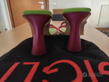 Sandali con tacco taglia 36 fucsia e verde sulla pianta. Segni sulla pianta
