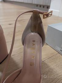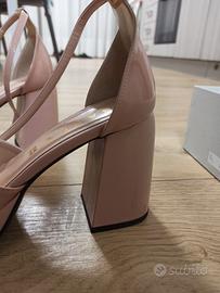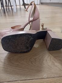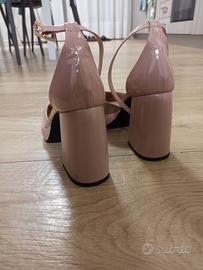 Sandali in pelle rosa cipria lucida con tacco 12 cm. Tacco largo e comodo, con plateau frontale per una maggiore stabilità. Aggiunto cuscinetto sul tallone per evitare sfregamenti. Usati 2 volte per cerimonie.