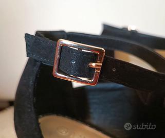Sandali neri scamosciati, con tacco da 7,5 cm e cinturino oro. Numero 39.