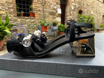 Sandali neri con tacco Tosca blu mod. SUKIE n. 38 con nappi neri, perle, gocce trasparenti e tacco forato. Prodotto in ottime condizioni.