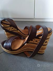 Sandali Geox marroni con zeppa e cinturino intrecciato alla caviglia. N.35.