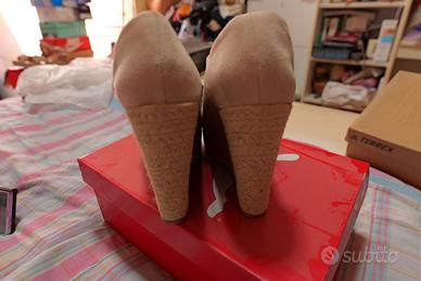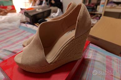 Eleganti sandali con zeppa in corda e tomaia scamosciata. - Zeppa alta in corda intrecciata. - Tomaia in morbido camoscio. - Design aperto sulla punta. - Dettaglio logo sulla soletta interna. - Altezza Tacco 12 cm. - Plateau 3 cm. - Marca Malien. Zeppe beige eleganti in morbido camoscio con fascia incrociata sul davanti e suola in corda intrecciata. Slanciano la figura con comfort e stile, perfette da abbinare a jeans bianchi, vestiti estivi o look da sera casual chic. Leggere, versatili e sempre alla moda: le zeppe indispensabili per ogni stagione.