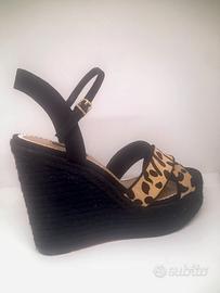 sandali con zeppa nera num 41 a pianta larga, usati una volta. Perfetti in tutto. Suola in gomma; zeppa cm 4; tacco cm 13,5; tomaia scamosciata maculata.