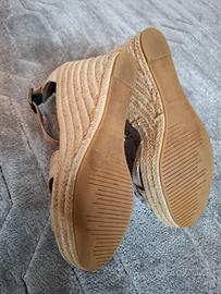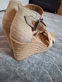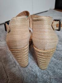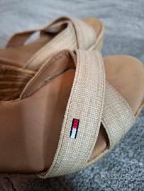 Sandali con zeppa originali Tommy Hilfiger in tessuto beige effetto lino con zeppa rivestita in corda. Taglia: 39 Altezza zeppa: circa 9 cm Cinturino regolabile alla caviglia Logo ricamato frontale Condizioni: ottime. La suola è in perfette condizioni (come nuova). Presenti solo lievi segni sulla zeppa in corda, tipici del materiale. Comode, stabili e perfette per l’estate.