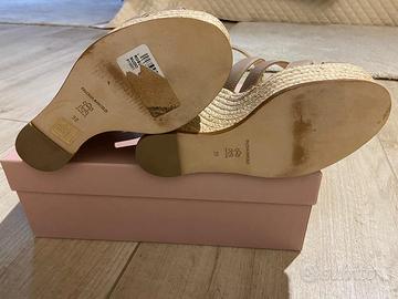 Sandali in pelle beige con zeppa in corda. Tacco 12 cm zeppa 4 cm. Dettagli color oro. Completo di scatola originale. Nuovi mai usati, vedi sigillo ancora intatto.