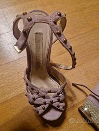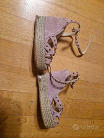 Sandali in camoscio lilla con zeppa, rifiniture dorate e piccole borchie. Paloma Barcelo'. Taglia 36