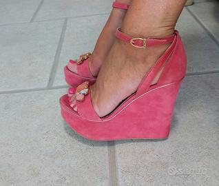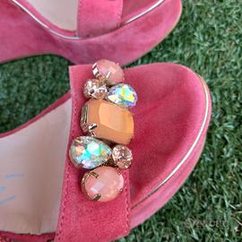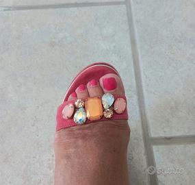 Bellissime scarpe artigianali in vera pelle. Camoscio color corallo con pietre applicate. Andrea Morelli. Leggerissime. Indossate una sola volta.