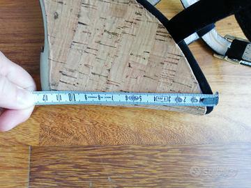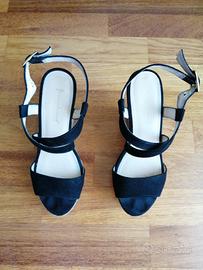 Sandali neri con zeppa in sughero e cinturino alla caviglia, numero 36. I 2 cinturini sono leggermente spellati nella parte interna (vedere foto). Il resto è in ottime condizioni. La zeppa è alta 12 cm (nella parte più alta), il plateau 3 cm.