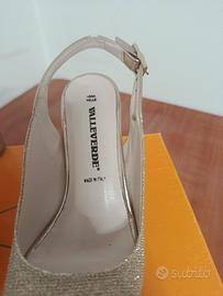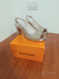 Sandali Valleverde con cinturino alla caviglia e tomaia glitterata color oro/argento. Usati una sola volta