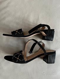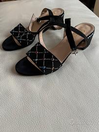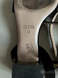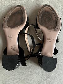 Eleganti sandali neri da sera, con tacco e decorazioni con pietre colorate. Cinturino alla caviglia regolabile. Tacco alto 5 cm circa Taglia 38 Usati in un paio di occasioni (suole nuova).