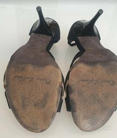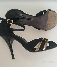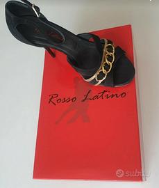 Sandali da Tango come nuovi marca Rossolatino, in vera pelle dentro e fuori, esterno in camoscio nero con fascia pelle color oro e motivo catena dorata, suola in vero cuoio, N.37 Tacco H.9.5 cm. pianta stretta, usati una sola volta, perfetti, vendo per inutilizzo