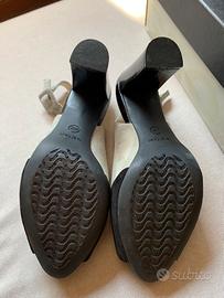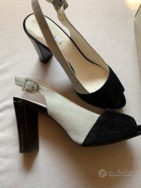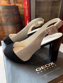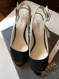 Vendo sandali N.37, Geox, come Nuovi, usati in un unica occasione. Caratteristiche: • Punta aperta e cinturino posteriore con fibbia regolabile, tacco largo di circa 10 cm. • Tomaia in pelle scamosciata Color nero e grigio/ghiaccio con tacco in vernice. • Suola dotata della tecnologia Respira, tipica di Geox, che garantisce traspirabilità e comfort.
