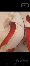 bellissimo sandali originali in pelle bianca con fiocco in pelle e raso, tacco cm .8 . interno foderato in raso rosso. indossati pochissime volte. pari al nuovo