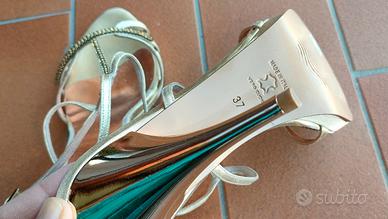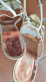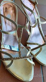 Vendo sandali MAI INDOSSATI (con cartellino ancora attaccato e la sua scatola). Tacco 10 cm. Colore Oro con Swarovski. IDEALI PER FESTE E CERIMONIE. Unico difetto visibile in foto: la doratura presente sul fondo in pelle della calzatura tende a togliersi. Nonostante questo sono PERFETTAMENTE INDOSSABILI!!