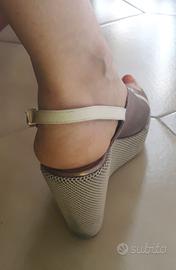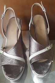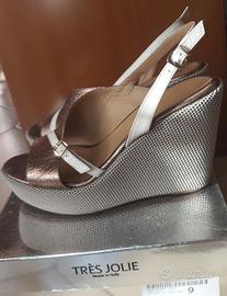 Sandali donna, numero 39, marca Tres Jolie color bronzo. Comoda zeppa altezza 12 cm circa. Usati e in buone condizioni, con leggere piccole scoloriture sul plantare (come si può vedere in foto).