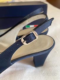 Sandali donna da cerimonia brand Made in Italy Musella in tessuto raso colore blu polvere con strass decorativi, punta e tallone aperto, cinturino con fibbietta, suola in vero cuoio, taglia 36, indossate solo una volta, in ottime condizioni.