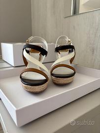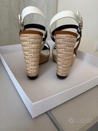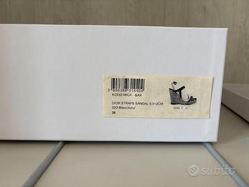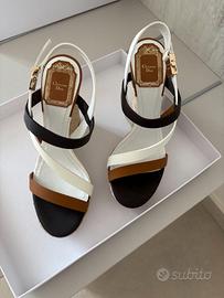Vendo, causa inutilizzo, nuovissimi sandali donna Christian Dior originali, mai indossati, euro 230 ( prezzo di listino euro 530 ). Misura 36. Vera pelle, colore bianco, moka, cuoio. Chiusura alla caviglia regolabile, punta tonda, tacco a zeppa. Altezza tacco : 9,5 cm . Altezza del plateau : 2 cm . Articolo originale acquistato presso la Boutique Dior di Milano, Via Montenapoleone 12, 20121.