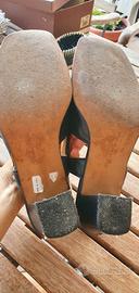 Sandali donna tg 39, Calzatura in vera pelle, molto morbida, molto confortevoli. Usati poco, sono ancora in perfetto stato, pelle e tomaia sono in ordine e pulite, piccola abrasione in punta, tacco nuovo in gomma antiscivolo. Tacco comodo a base larga e alto cm 4,8. Condizioni ottime