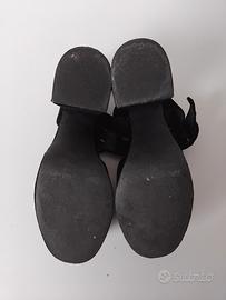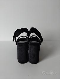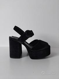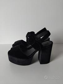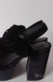 Sandali modelloMasiedel brandJeffrey Campbell, caratterizzati da velluto nero, tacco largo e suola platform.