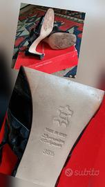 Dalle foto potete notare che trattasi di un décolleté nero, elegante, aperto in punta con tacco di 8 cm, suola in cuoio, verniciato e con cinturino "comodo" grazie al pezzetto di elastico di cui è dotato. Le strisce di pelle che rivestono il collo del piede sono unite da una retina in tinta e trasparente con effetto nude look.