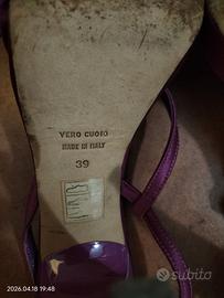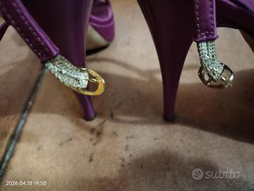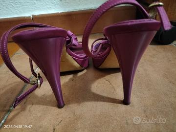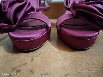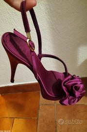 Eleganti sandali da donna con un tocco floreale colore lilla acceso. Design con cinturino alla caviglia. Dettaglio a forma di rosa sul davanti. Materiale satinato. Tacco 12 cm con zeppa davanti di 2 cm. Elastico del cinturino leggermente deteriorato ma facilmente sostituibile (vedi foto 8)