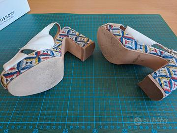 Sandali da donna numero 35 con incrocio sul davanti e cinturino alla caviglia, tacco largo e plateau con fantasia geometrica multicolore. Usati, con segni di usura evidenti sulla suola e all’interno della soletta, ma ancora in buone condizioni generali e perfettamente utilizzabili. Completi di scatola, tutto come da foto.