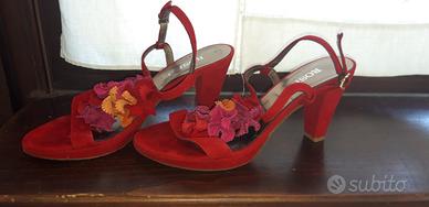 SANDALI DONNA Rosini numero 37, in camoscio colore rosso, con motivo arricciato sul davanti. Calzata comoda, tacco 8,5. Perfetti, usati una sola volta.