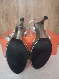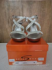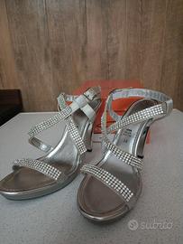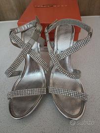 Sandali donna n.39 color argento in pelle, altezza tacco cm 10, con cinturino in pelle e strass argento. Nuovi, usati solo una volta per una cerimonia. Made in Italy, con scatola originale. Condizioni perfette, vedi le foto allegate. Se interessati contattare il n.ro 3357277237. Disponibile anche a spedizione con spese a carico acquirente. Grazie