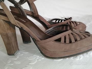 Sono in vera pelle nabuk. Hanno plateau che "riduce" il tacco comunque comodo.