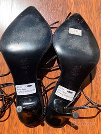 Sandali donna - colore nero con fascia ricoperta da paillettes color arancione - Tacchi stiletto alti 11 cm - allacciatura alla schiava - Perfetti con outfit tanto sportivi quanti eleganti - Taglia 38 - Made in Italy