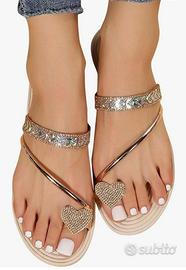 Sandali donna estivi modello a ciabatta infradito con tacco piatto, numero 39, suola tallone leggermente rialzata (1 cm. circa) per una maggiore comodità durante la camminata, e permette di passare anche molto tempo in piedi indossandole. Adatte a qualsiasi tipo di occasione, anche passeggiata serale, visti gli ornamenti a strass decorativi brillanti che donano un tocco di eleganza. Nuovi con scatola mai utilizzati causa regalo numero errato. Bellissimi e di sicuro effetto. Suola antiscivolo, cinturini morbidissimi e non fatidiosi (non rigidi come può sembrare in foto intendo dire). Comode e leggere.