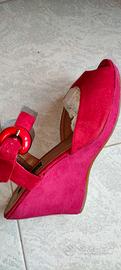 Vendo scarpe in OTTIMO STATO usate un paio di volte. Scamosciate di un BELLISSIMO COLORE ROSSO FUOCO con zeppa fucsia di 9 cm.
