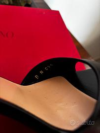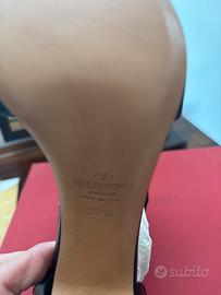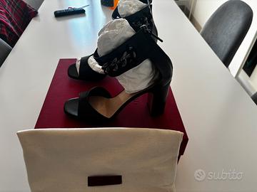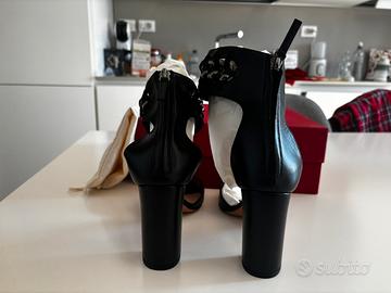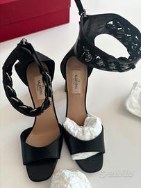 Bellissimi sandali da donna neri con tacco largo e cinturino alla caviglia impreziosito da catena metallica intrecciata. Design elegante e moderno, perfetti per cerimonie, serate o outfit ricercati. * Taglia: 38,5 * Colore: nero * Tacco stabile e comodo * Chiusura con zip sul retro * Ottima qualità dei materiali e finiture curate Condizioni: pari al nuovo (mai utilizzate, come da foto) nuove mai indossati con scatola e dustbag