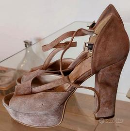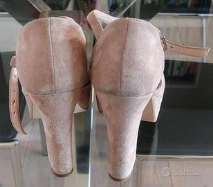 Vendo sandali da donna marca VI&VI, numero 37, realizzati in vera pelle scamosciata di colore cipria. Presentano un tacco largo alto circa 11 cm e un plateau frontale di circa 3,5 cm. Il cinturino a T è regolabile grazie alla fibbia color argento.