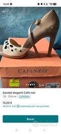 sandali n.38 in camoscio colore panna e vernice color tortora, con pietre applicate, marca cafè noir, tacco cm 9 e plateau 1 cm. Usate pochissimo
