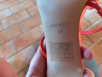Sandali ecopelle 38.5 colore arancio-rosso corallo, marca Nine West, anello attorno al primo dito del piede, due fascette sull'avampiede, design minimal, racco a rocchetto di 5,5 cm