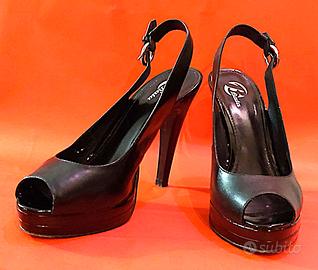 Splendidi sandali da sera e per le occasioni importanti. In vera pelle, di colore nero. Marca Bata. Tacco 12cm, zeppa anteriore 2cm. All’interno del tacco presentano una piccola scalfitura della pella (vedere dettaglio foto 5), che non è visibile quando il sandalo è indossato e che può essere coperta con un po’ di lucido. I sandali sono stati usati pochissimo e sono in ottimo stato. Misura 38.