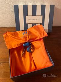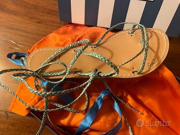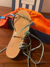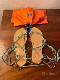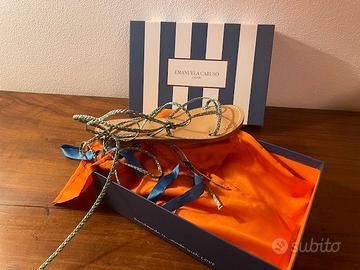 Bellissimi sandali modello schiava di Emanuela Caruso, pelle e cuoio. Colore turchese e bianco. completi di scatola e busta di stoffa. Usati 2 volte, praticamente nuovi, numero 39. Ritiro a Manerbio Grazie