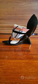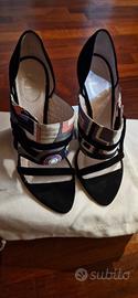 Beloismi sandali con plateau particolare e originale e firmati Emilio Pucci. Sono in suede nero con dettagli multocolor. perfetti per esser originali e non convenzionali. Usato solo 1 volta in ottime condizioni.