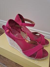 vendo sandali espadrillas della Castañer n.36. Tessuto di colore fucsia .Piccoli difetti all interno/sotto del passante alla caviglia (quindi non visibili esteticamente quando indossate) Altezza tacco cm 8. Provviste della loro confezione originale