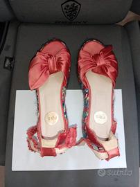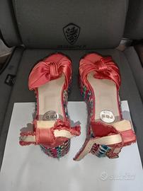 Splendidi sandali con zeppa (espadrillas platform) del brand spagnolo RAS, noti per il loro design originale e l'alta qualità dei materiali. Un modello vivace, perfetto per dare un tocco di colore a un outfit estivo o per un'occasione speciale. Colore: Rosso vibrante con zeppa decorata in tessuto intrecciato multicolor (azzurro, rosa, verde, crema). Dettagli estetici: Grande fiocco in raso sulla parte anteriore che dona un aspetto elegante e romantico. Chiusura: Cinturino alla caviglia con fibbia dorata per una calzata sicura. Stile: Boho-chic / Estivo / Plateau. Condizioni: Ottime. Brand: RAS (Made in Spain).