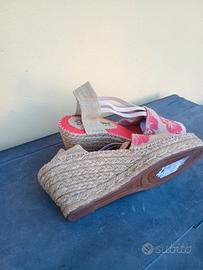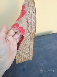 Bellissimi sandali Espadrillas con fantasia fiori di ibisco colore rosso su fondo beige, tacco in corda cm.7, nr.38-38,5 (sulla suola è indicato 39 ma calza più piccolo). Fasce elastiche per avvolgere il piede e garantire stabilità. Ottime condizioni. Posso spedire.