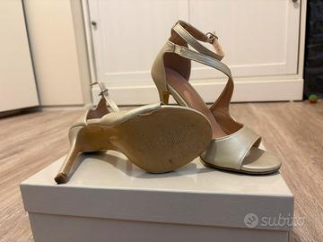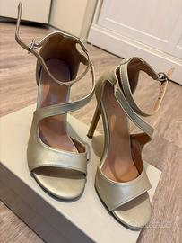 Sandali estivo color oro, tacco 8, con segni di usura sulla suola. Usati pochissimo