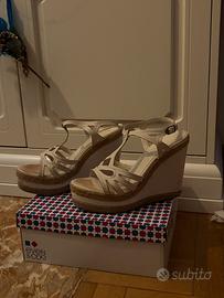 Calzature sandali, misura 38,5 pelle, bianche, tacco cm 10 circa plateau,condizioni ottime - zona ritiro Roma - oppure spedizione, prezzo € 20