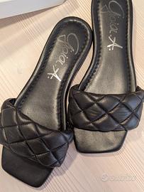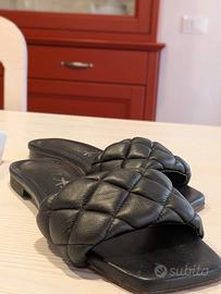 Il modello è un sandalo tipo "slide" o ciabattina, caratterizzato da una fascia imbottita e trapuntata a rombi e da una punta squadrata.